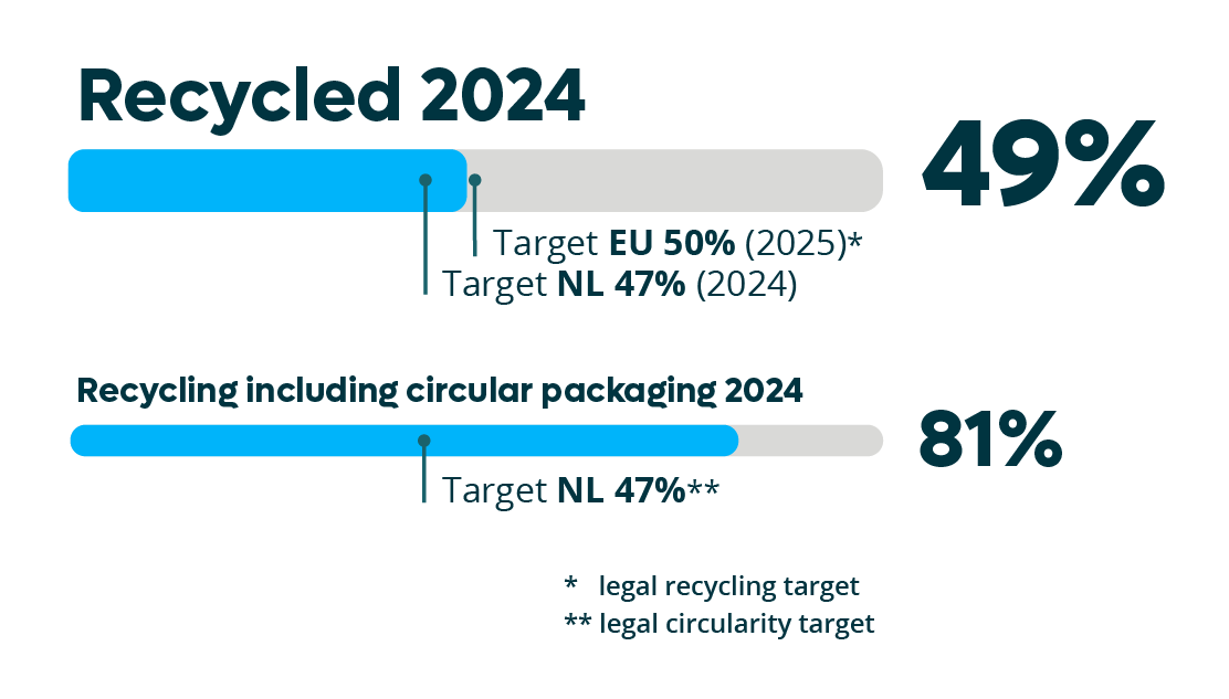 In 2024, 81% of plastic packaging was either recycled or reused. A nice development, but we want to make plastic packaging completely circular by 2050.