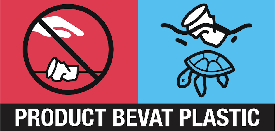 Bepaalde producten zoals filtersigaretten, drinkbekers en maandverband dragen vanaf 3 juli 2021 een opvallende aanduiding op de verpakking. Die geeft aan dat er kunststof in zit, dat het in de afvalbak thuishoort en dat dit als zwerfafval een negatief effect heeft op het milieu.